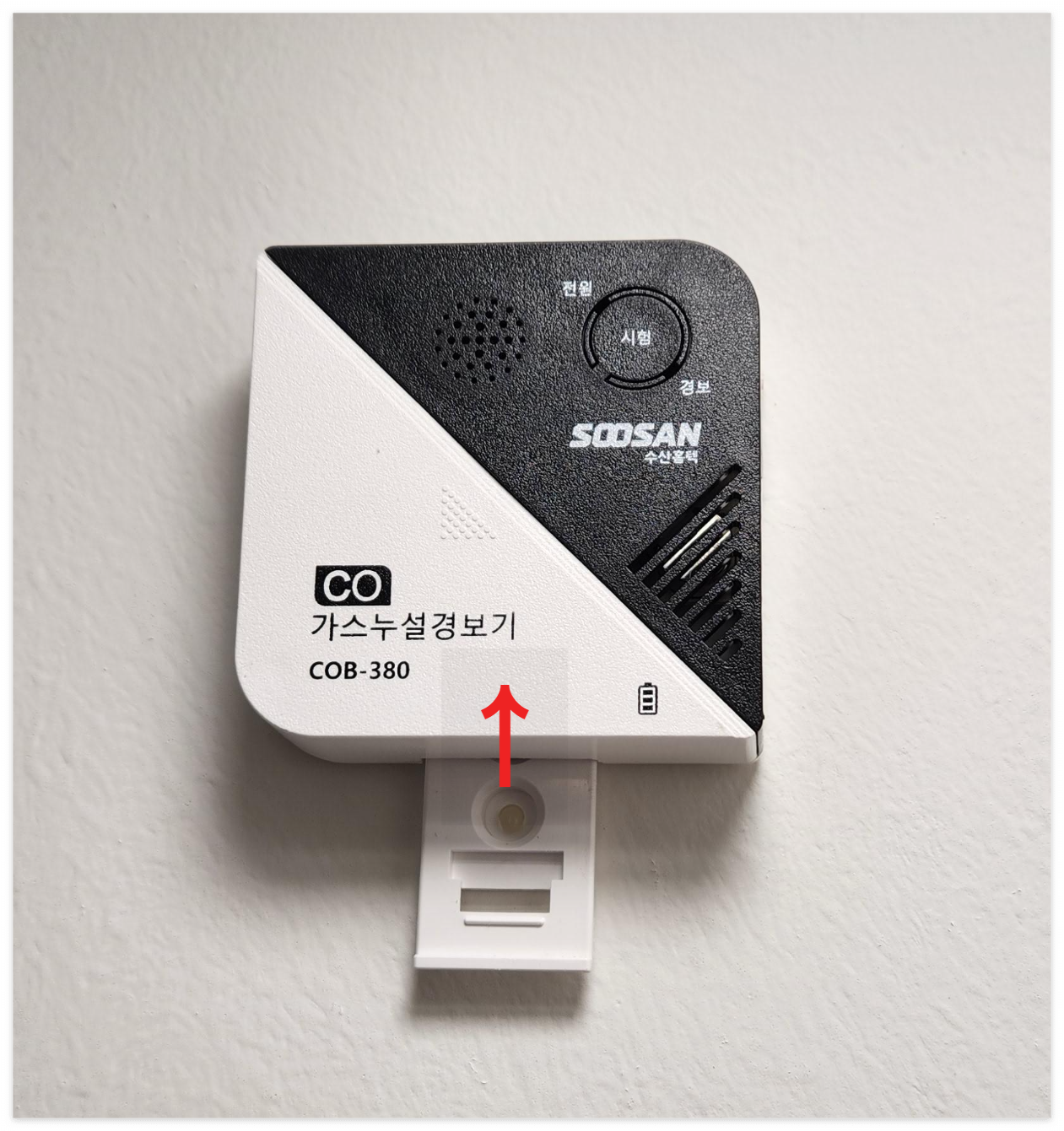 벽면에 저렇게 거치대가 박혀있는 형태이니, 위로 들어 올려서 빼고 건전지를 교체하고 난 후엔 다시 위에서 아래 방향으로 딸깍 눌러주는 느낌으로 끼워두면 됩니다!