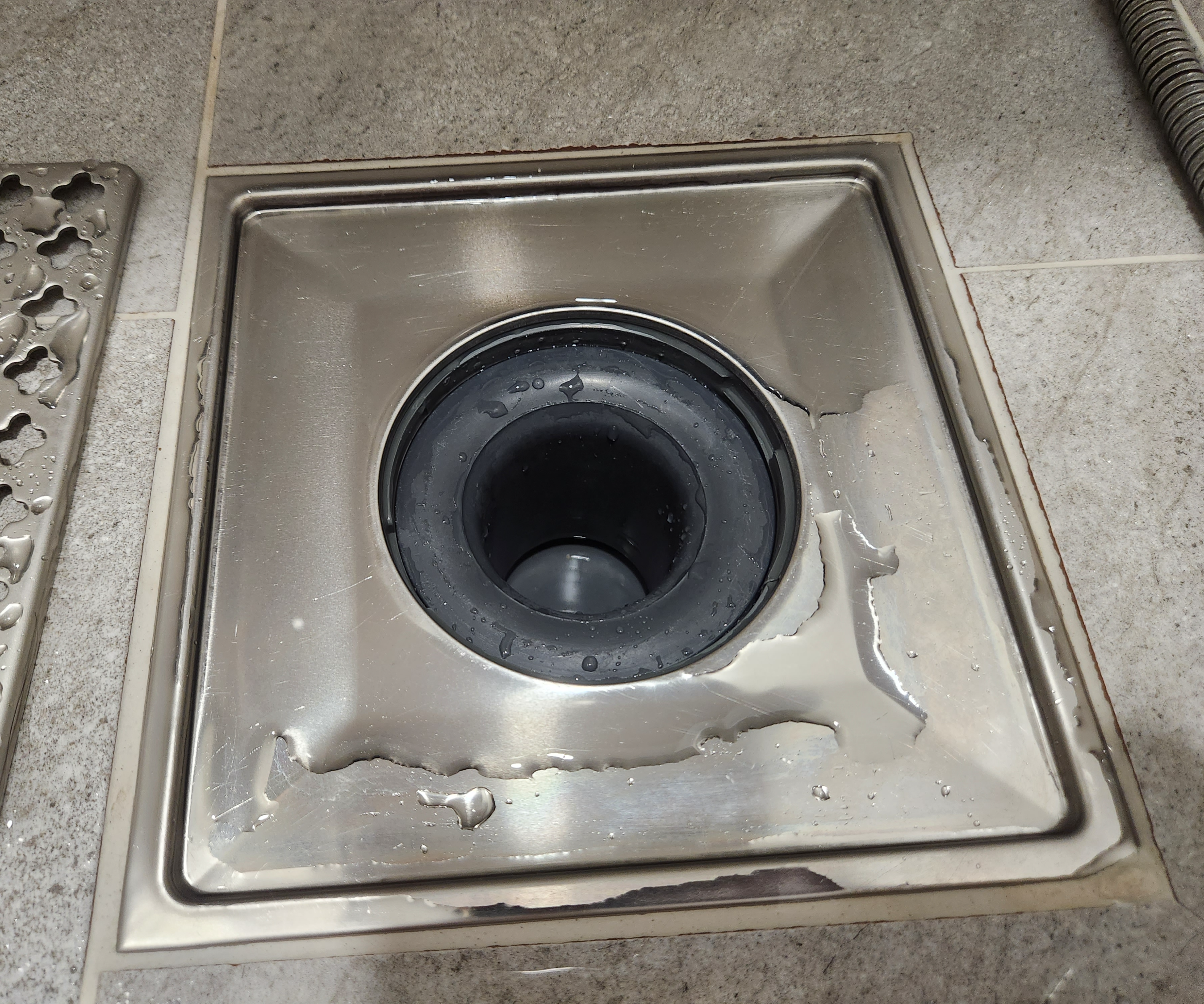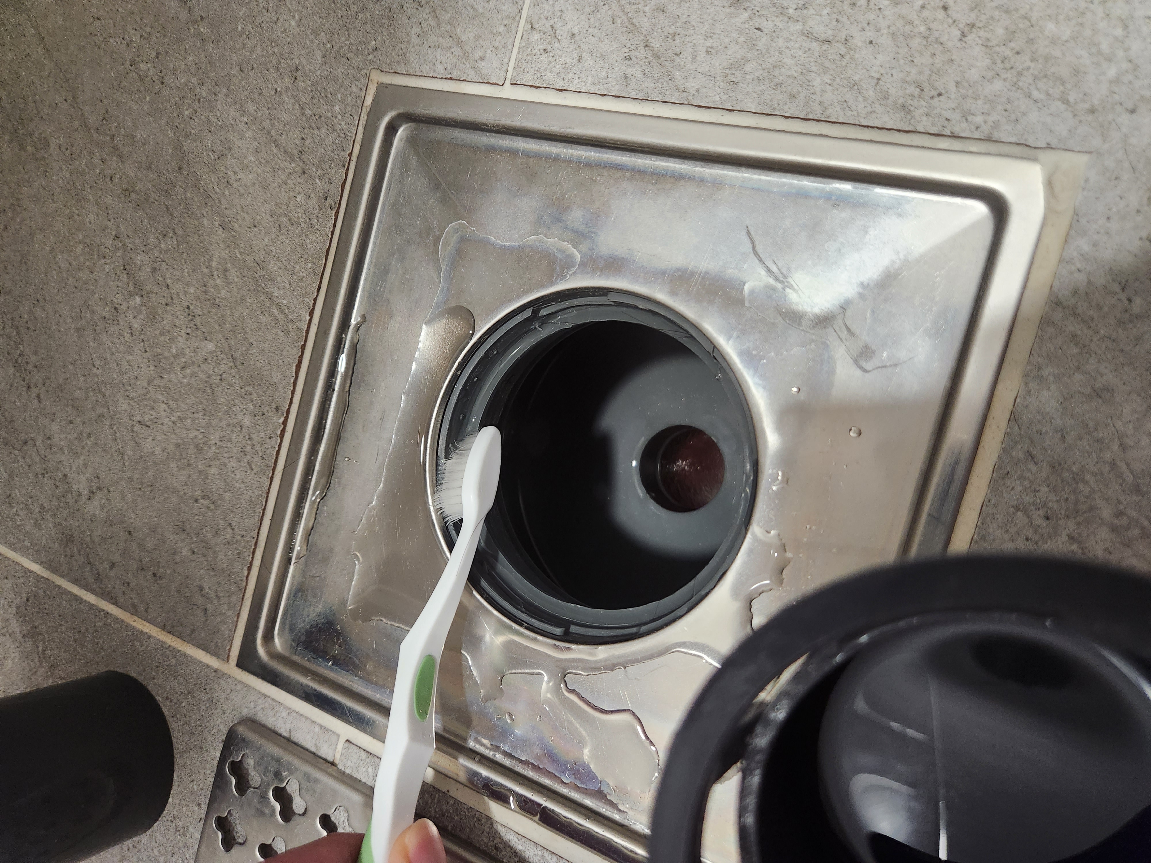 화장실 배수구는 매일 물이 흘러가기 때문에 물때가 두껍더라도 생각보다 잘 벗겨집니다.(물에 불어있는 상태)